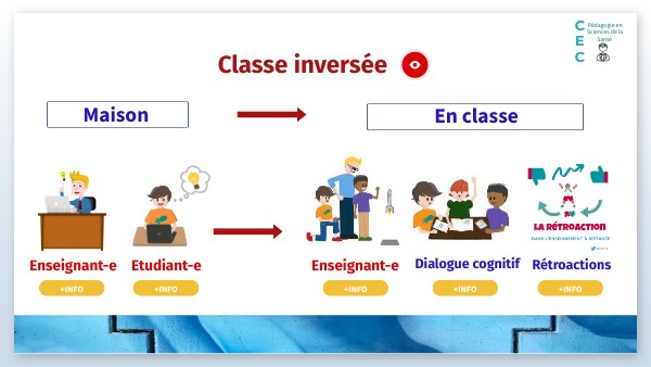Les étudiants ont accès aux ressources à l’avance et peuvent ainsi les consulter à leur rythme avant de venir en classe.A travers les réponses des étudiants et surtout leur raisonnement de chacun, l'enseignant régule son enseignement selon les besoins particuliers. L'enseignant donne des rétroactions ciblées et efficaces. Ainsi, le temps de classe peut être réservé pour les accompagner. Le travail collaboratif permet aux étudiants d’échanger et de confronter leurs idées à celles des autres.