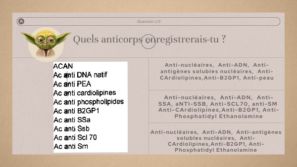Essaie encore ! Rappelle toi que pour les anti-cardiolipines et les anti-B2 GP1, il faut enregistrer systématiquement les IgG et les IgM
