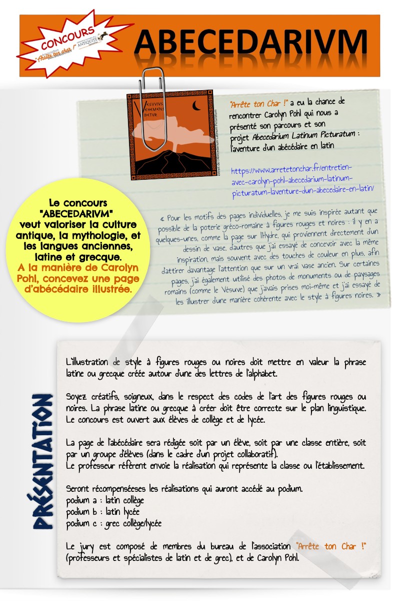 L’illustration de style à figures rouges ou noires doit mettre en valeur la phrase latine ou grecque créée autour d’une des lettres de l’alphabet. Soyez créatifs, soigneux, dans le respect des codes de l’art des figures rouges ou noires. La phrase latine ou grecque à créer doit être correcte sur le plan linguistique. Le concours est ouvert aux élèves de collège et de lycée. La page de l’abécédaire sera rédigée soit par un élève, soit par une classe entière, soit par un groupe d’élèves (dans le cadre d’un projet collaboratif). Le professeur référent envoie la réalisation qui représente la classe ou l’établissement. Seront récompenséeses les réalisations qui auront accédé au podium. podium a : latin collège podium b : latin lycée podium c : grec collège/lycée Le jury est composé de membres du bureau de l’association “Arrête ton Char !” (professeurs et spécialistes de latin et de grec), et de Carolyn Pohl.