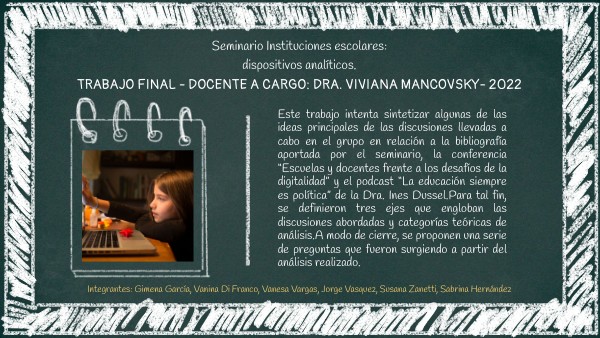 Este trabajo intenta sintetizar algunas de las ideas principales de las discusiones llevadas a cabo en el grupo en relación a la bibliografía aportada por el seminario, la conferencia “Escuelas y docentes frente a los desafíos de la digitalidad” y el podcast “La educación siempre es política” de la Dra. Ines Dussel. Para tal fin, se definieron tres ejes que engloban las discusiones abordadas y categorías teóricas de análisis. A modo de cierre, se proponen una serie de preguntas que fueron surgiendo a partir del análisis realizado.