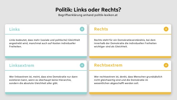 Links bedeutet, dass mehr (soziale und politische) Gleichheit angestrebt wird, manchmal auch auf Kosten individueller Freiheiten.