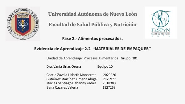 Unidad de Aprendizaje: Procesos Alimentarios Grupo: 301 Dra. Vania Urías Orona Equipo 10 Garcia Zavala Lizbeth Monserrat 2020226 Gutiérrez Martínez Ximena Abigail 2025977 Macias Santiago Debanny Yadira 2018383 Sena Cazares Valeria 1927268