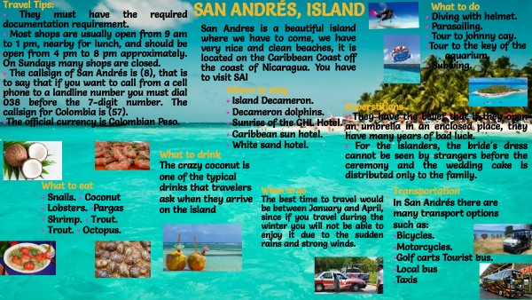 Travel Tips: • They must have the required documentation requirement. • Most shops are usually open from 9 am to 1 pm, nearby for lunch, and should be open from 4 pm to 8 pm approximately. On Sundays many shops are closed. • The callsign of San Andrés is (8), that is to say that if you want to call from a cell phone to a landline number you must dial 038 before the 7-digit number. The callsign for Colombia is (57). •The official currency is Colombian Peso.