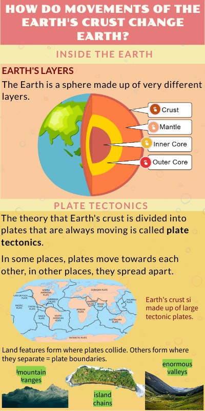 The theory that Earth's crust is divided into plates that are always moving is called plate tectonics. In some places, plates move towards each other, in other places, they spread apart.