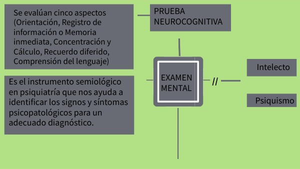 Estado de ánimo, Expresión del pensamiento, Contenido del pensamiento, Alteraciones perceptivas, Ideación suicida y/u homicida.