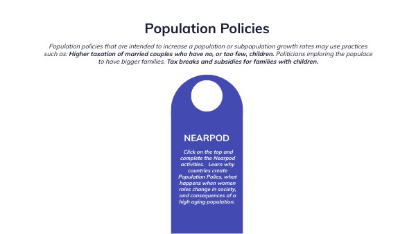 Click on the top and complete the Nearpod activities. Learn why countries create Population Polies, what happens when women roles change in society, and consequences of a high aging population.