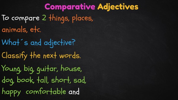To compare 2 things, places, animals, etc. What´s and adjective? Classify the next words. Young, big, guitar, house, dog, book, tall, short, sad, happy comfortable and expensive.