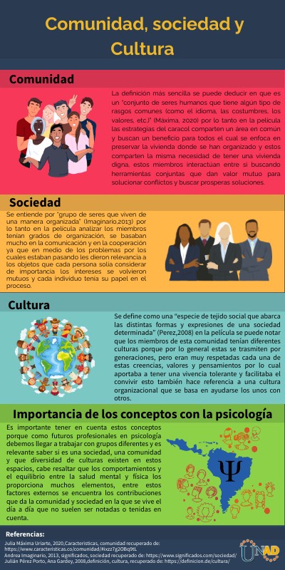 Julia Máxima Uriarte, 2020,Caracteristicas, comunidad recuperado de: https://www.caracteristicas.co/comunidad/#ixzz7g2OBq9tL Andrea Imaginario, 2013, significados, sociedad recuperado de: https://www.significados.com/sociedad/ Julián Pérez Porto, Ana Gardey, 2008,definición, cultura, recuperado de: https://definicion.de/cultura/