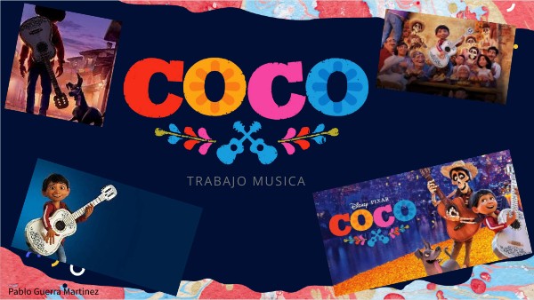 Coco es una pelicula creada por Disney y Pixar. Trarta sobre un niño, llamado Miguel, que quiere ser músico pero su familia se lo prohibe. Entonces llega hasta un cementerio donde roba la guitarra de Ernesto de la Cruz, pero al tocarla ,algo pasa y llega al mundo de los muertos, donde conoce a sus familiares difuntos y a una persona a la cual no le dejan pasar al mundo de los vivos. Sus familiares lo bendicen para que pueda volver a su mundo, pero con la condicion de no volver a tocar nunca más, Miguel no lo acepta y se dispone a encontrar a Ernesto, ya que piensa que es su tatarabuelo, para que lo bendiga y pueda tocar música.