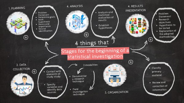 Mapa mental de as etapas para el inicio de una investigación estadística (planeación, recolección, organización, análisis y presentación de resultados)
