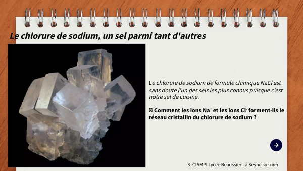 Le chlorure de sodium de formule chimique NaCl est sans doute l'un des sels les plus connus puisque c'est notre sel de cuisine. ➜ Comment les ions Na+ et les ions Cl- forment-ils le réseau cristallin du chlorure de sodium ?