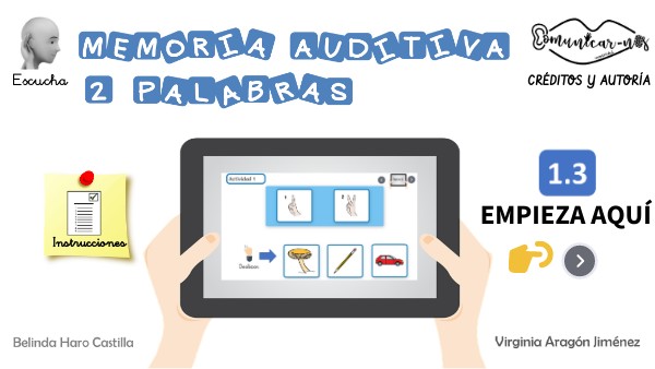 OBJETIVO GENERAL: - Mejorar o desarrollar la memoria auditiva. OBJETIVO ESPECÍFICO: - Recordar, de forma ordenada, series de dos palabras en orden directo. DESARROLLO DE LA ACTIVIDAD: Se le presentan al niño/a dos palabras de manera auditiva. Tras haberlas escuchado, el alumno/a deberá repetir las dos palabras en el mismo orden que han sido reproducidas pasando posteriormente a la siguiente pantalla. A continuación, el niño/a tendrá que seleccionar y arrastrar en el orden correcto, las dos palabras escuhadas . VARIANTES: Inventar una oración con algunas de las palabras que se proponen. Contar el número de sílabas de las palabras. Pragmática: qué es, para qué sirve…