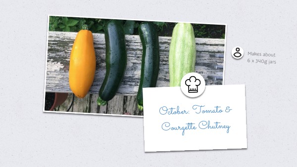 800g tomatoes, roughly chopped 800g green or yellow courgettes, cut into small cubes 500g onions, peeled & chopped 700g granulated sugar 600ml cider vinegar or white wine vinegar 2cm piece of fresh ginger, peeled & finely chopped 1 tsp ground coriander pinch dried chilli flakes 1 tsp salt black pepper