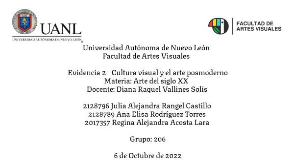 Universidad Autónoma de Nuevo León Facultad de Artes Visuales Evidencia 2 - Cultura visual y el arte posmoderno Materia: Arte del siglo XX Docente: Diana Raquel Vallines Solís 2128796 Julia Alejandra Rangel Castillo 2128789 Ana Elisa Rodríguez Torres 2017357 Regina Alejandra Acosta Lara Grupo: 206 6 de Octubre de 2022