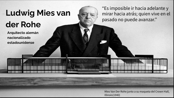 Uno de los arquitectos más influyentes del siglo XX y se le reconoce como uno de los pioneros de la arquitectura moderna.Su famoso aforismo "menos es más" aún sigue siendo muy utilizado, incluso por quienes desconocen sus orígenes Mies Van Der Rohe, quien originalmente respondía al nombre de Ludwig Mies, fue un arquitecto autodidacta.Nacio el 27 de marzo en 1886 en Aquisgrán (Aachen), Alemania. Es el máximo exponente del siglo XX en la construcción de acero y vidrio. Se influencio por los nuevos conceptos vanguardistas de ortogonalidad , abstracción y fluidez en el espacio , llegando a ser uno de los representantes del racionalismo arquitectónico. Falleció el 17 de agosto de 1969 en Chicago, EEUU.