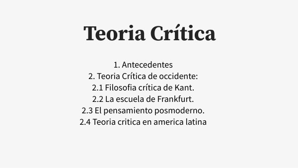 1. Antecedentes 2. Teoria Crítica de occidente: 2.1 Filosofia crítica de Kant. 2.2 La escuela de Frankfurt. 2.3 El pensamiento posmoderno. 2.4 Teoria critica en america latina