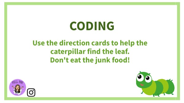 Use the direction cards to help the caterpillar find the leaf. Don't eat the junk food!