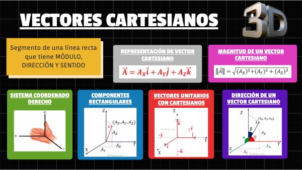 Los vectores unitarios cartesianos: se usan para designar las direcciones de los ejes X, Y, Z respectivamente. El sentido de estos vectores se representa con un signo de más o menos, dependiendo de su dirección.