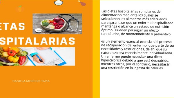 Las dietas hospitalarias son planes de alimentación mediante los cuales se seleccionan los alimentos más adecuados, para garantizar que un enfermo hospitalizado mantenga o alcance un estado de nutrición óptimo . Pueden perseguir un efecto terapéutico, de mantenimiento o preventivo es un elemento esencial esencial del proceso de recuperación del enfermo, que parte de sus necesidades y restricciones, de ahí que su naturaleza sea esencialmente individualizada. Un enfermo puede necesitar una dieta hipercalórica debido a que está desnutrido, mientras otros, por el contrario, necesitarán una restricción en la ingesta de calorías.