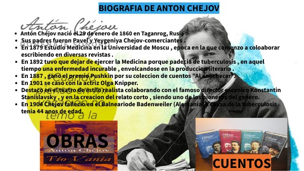Destaco en el teatro de estilo realista colaborando con el famoso director escenico Konstantin Stanislavsky , y en la creacion del relato corto , siendo uno de los pioneros del genero.