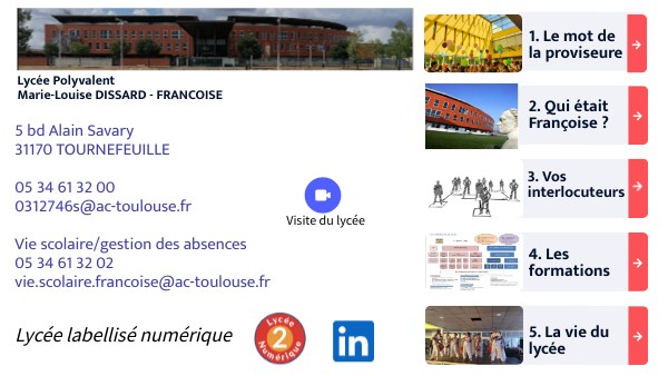 5 bd Alain Savary 31170 TOURNEFEUILLE 05 34 61 32 00 0312746s@ac-toulouse.fr Vie scolaire/gestion des absences 05 34 61 32 02vie.scolaire.francoise@ac-toulouse.fr