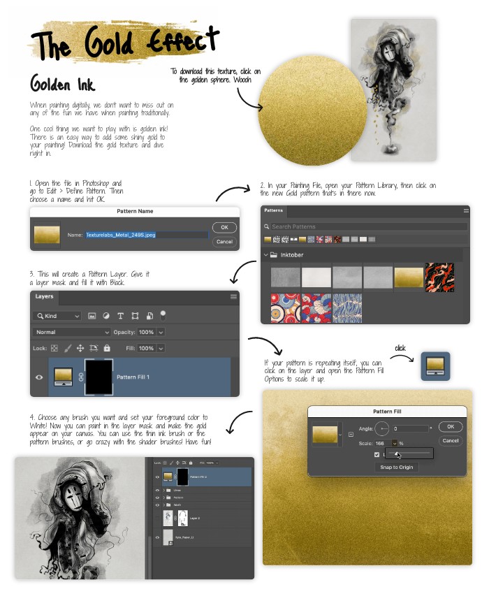 When painting digitally, we don't want to miss out on any of the fun we have when painting traditionally. One cool thing we want to play with is golden ink! There is an easy way to add some shiny gold to your painting! Download the gold texture and dive right in.