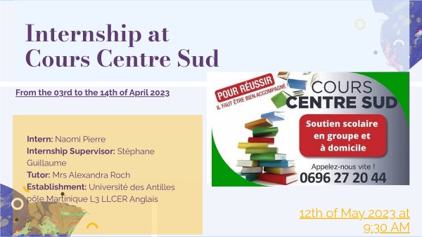Intern: Naomi Pierre Internship Supervisor: Stéphane Guillaume Tutor: Mrs Alexandra Roch Establishment: Université des Antilles pôle Martinique L3 LLCER Anglais