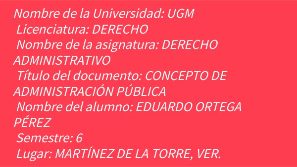 Nombre de la Universidad: UGM Licenciatura: DERECHO Nombre de la asignatura: DERECHO ADMINISTRATIVO Título del documento: CONCEPTO DE ADMINISTRACIÓN PÚBLICA Nombre del alumno: EDUARDO ORTEGA PÉREZ Semestre: 6 Lugar: MARTÍNEZ DE LA TORRE, VER.