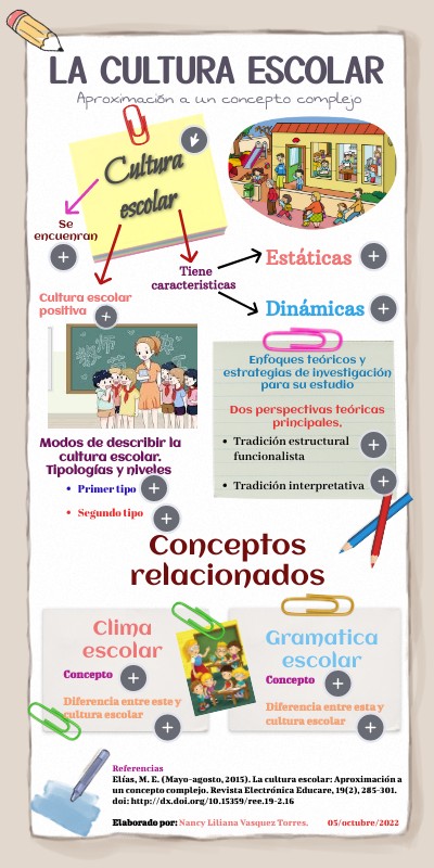 Referencias Elías, M. E. (Mayo-agosto, 2015). La cultura escolar: Aproximación a un concepto complejo. Revista Electrónica Educare, 19(2), 285-301. doi: http://dx.doi.org/10.15359/ree.19-2.16 Elaborado por: Nancy Liliana Vasquez Torres. 05/octubre/2022
