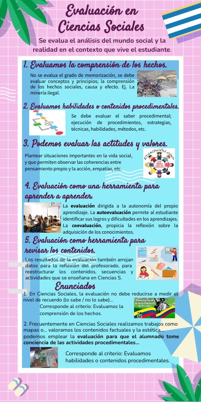 No se evalua el grado de memorización, se debe evaluar conceptos y principios; la comprensión de los hechos sociales, causa y efecto. Ej. La minería ilegal.
