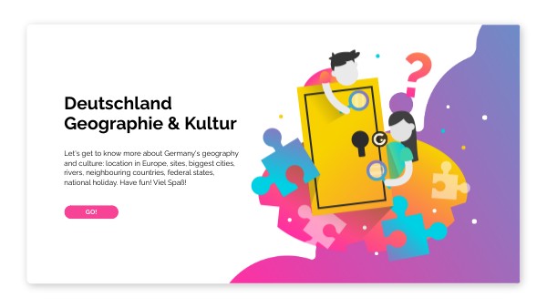 Let's get to know more about Germany's geography and culture: location in Europe, sites, biggest cities, rivers, neighbouring countries, federal states, national holiday. Have fun! Viel Spaß!