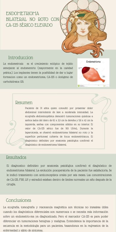 Paciente de 31 años quien consultó por presentar dolor abdominal intermitente de leve a moderada intensidad. La ecografía abdominopélvica demostró tumoraciones quisticas a ambos lados del útero de 6,1 x 3,3 cm la derecha y 5,8 x 4,1 cm la izquierda, ambas con componentes sólidos en su interior. El valor de CA-125 sérico fue de 183 UI/mL. Durante la laparotomía, se observó endometrioma bilateral no roto y la superficie peritoneal cubierta de focos endometriósicos. El diagnóstico definitivo por anatomía patológica confirmó el diagnóstico de endometrioma bilateral.