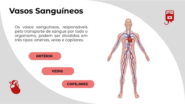 Os vasos sanguíneos, responsáveis pelo transporte de sangue por todo o organismo, podem ser divididos em três tipos: artérias, veias e capilares.