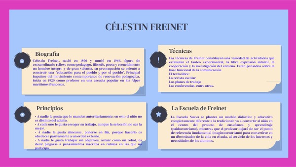 Celestin Freinet, nació en 1896 y murió en 1966, figura de extraordinario relieve como pedagogo, filósofo, poeta y esencialmente un hombre íntegro y de gran valentía, su preocupación se orientó a construir una "educación para el pueblo y por el pueblo". Principal impulsor del movimiento contemporáneo de renovación pedagógica, inicia en 1920 como profesor en una escuela popular en los Alpes marítimos franceses.
