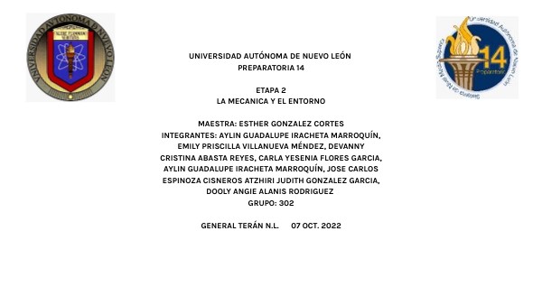 UNIVERSIDAD AUTÓNOMA DE NUEVO LEÓN PREPARATORIA 14 ETAPA 2 LA MECANICA Y EL ENTORNO MAESTRA: ESTHER GONZALEZ CORTES INTEGRANTES: AYLIN GUADALUPE IRACHETA MARROQUÍN, EMILY PRISCILLA VILLANUEVA MÉNDEZ, DEVANNY CRISTINA ABASTA REYES, CARLA YESENIA FLORES GARCIA, AYLIN GUADALUPE IRACHETA MARROQUÍN, JOSE CARLOS ESPINOZA CISNEROS ATZHIRI JUDITH GONZALEZ GARCIA, DOOLY ANGIE ALANIS RODRIGUEZ GRUPO: 302 GENERAL TERÁN N.L. 07 OCT. 2022