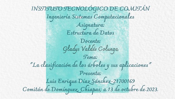 INSTITUTO TECNOLÓGICO DE COMITÁN Ingeniería Sistemas Computacionales Asignatura: Estructura de Datos Docente: Gladys Valdés Colunga Tema: "La clasificación de los árboles y sus aplicaciones" Presenta: Luis Enrique Díaz Sánchez-21700169 Comitán de Domínguez, Chiapas; a 13 de octubre de 2023.