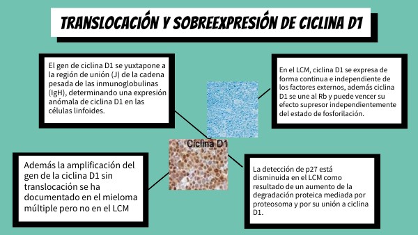 El gen de ciclina D1 se yuxtapone a la región de unión (J) de la cadena pesada de las inmunoglobulinas (IgH), determinando una expresión anómala de ciclina D1 en las células linfoides.