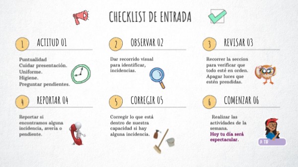 PuntualidadCuidar presentación. Uniforme. Higiene. Preguntar pendientes.
