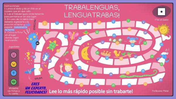 Juego tipo serpientes y escaleras en donde para avanzar tendrás que leer correctamente el trabalenguas sin equivocarte ni pausas. !Diviértete!
