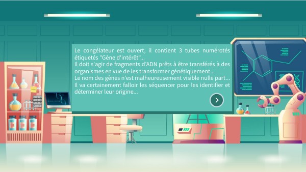 Le congélateur est ouvert, il contient 3 tubes numérotés étiquetés "Gène d'intérêt"... Il doit s'agir de fragments d'ADN prêts à être transférés à des organismes en vue de les transformer génétiquement... Le nom des gènes n'est malheureusement visible nulle part... Il va certainement falloir les séquencer pour les identifier et déterminer leur origine...