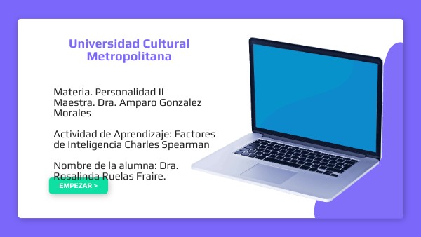 Materia. Personalidad IIMaestra. Dra. Amparo Gonzalez Morales Actividad de Aprendizaje: Factores de Inteligencia Charles Spearman Nombre de la alumna: Dra. Rosalinda Ruelas Fraire.