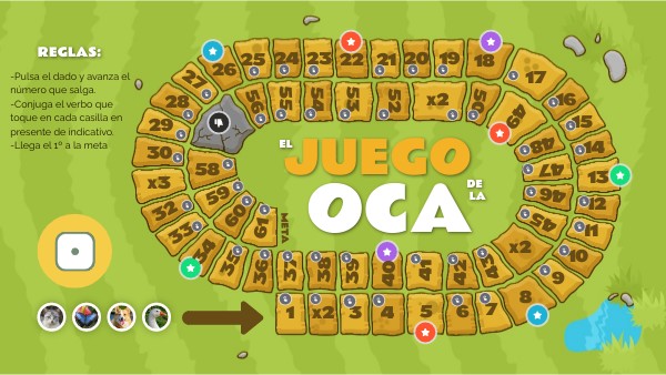 -Pulsa el dado y avanza el número que salga.-Conjuga el verbo que toque en cada casilla en presente de indicativo. -Llega el 1º a la meta