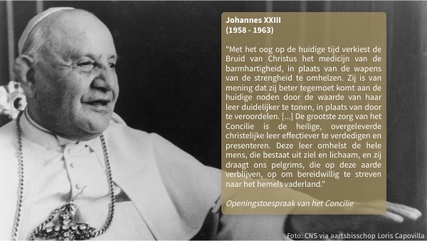 Johannes XXIII (1958 - 1963) "Met het oog op de huidige tijd verkiest de Bruid van Christus het medicijn van de barmhartigheid, in plaats van de wapens van de strengheid te omhelzen. Zij is van mening dat zij beter tegemoet komt aan de huidige noden door de waarde van haar leer duidelijker te tonen, in plaats van door te veroordelen. [...] De grootste zorg van het Concilie is de heilige, overgeleverde christelijke leer effectiever te verdedigen en presenteren. Deze leer omhelst de hele mens, die bestaat uit ziel en lichaam, en zij draagt ons pelgrims, die op deze aarde verblijven, op om bereidwillig te streven naar het hemels vaderland." Openingstoespraak van het Concilie