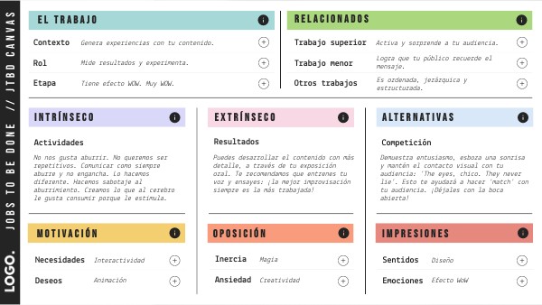 Pon en marcha la metodología Jobs To Be Done con esta plantilla interactiva y animada. Además de ser muy fácil de editar, te ayudará a analizar al detalle las necesidades de tu cliente y compartirlas con el equipo. ¡Ya es tuya!