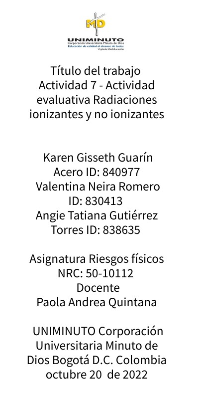Título del trabajo Actividad 7 - Actividad evaluativa Radiaciones ionizantes y no ionizantes Karen Gisseth Guarín Acero ID: 840977 Valentina Neira Romero ID: 830413 Angie Tatiana Gutiérrez Torres ID: 838635 Asignatura Riesgos físicos NRC: 50-10112 Docente Paola Andrea Quintana UNIMINUTO Corporación Universitaria Minuto de Dios Bogotá D.C. Colombia octubre 20 de 2022