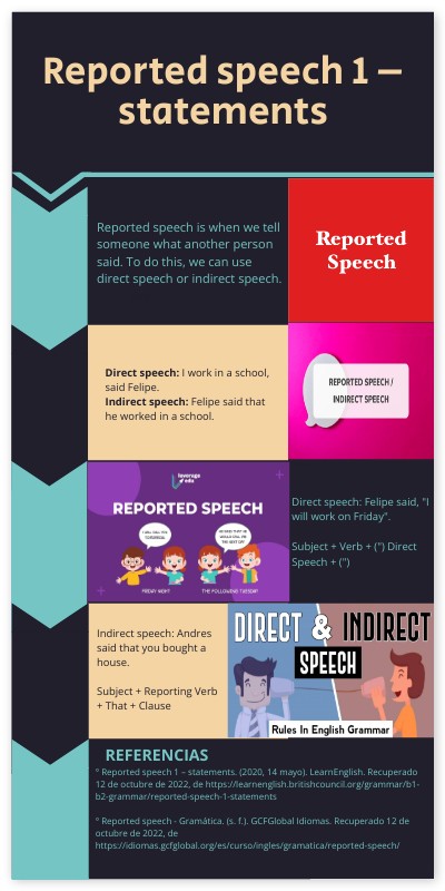 ° Reported speech 1 – statements. (2020, 14 mayo). LearnEnglish. Recuperado 12 de octubre de 2022, de https://learnenglish.britishcouncil.org/grammar/b1-b2-grammar/reported-speech-1-statements° Reported speech - Gramática. (s. f.). GCFGlobal Idiomas. Recuperado 12 de octubre de 2022, de https://idiomas.gcfglobal.org/es/curso/ingles/gramatica/reported-speech/