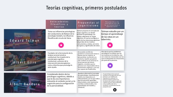 Tolman propone el concepto de mapa cognitivo, en donde durante el aprendizaje, los sujetos adquieren un mapa cognitivo, el cual se configura a partir de las relacionescognitivas adquiridas de los medios, instrumentos y metas, así como los signos y significados de estos.