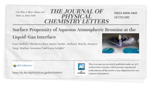 Dalam JURN, menyelidiki solvasi antarmuka dari berbagai senyawa berbasis bromin yang terlibat dalam aktivasi dan siklus brom pada antarmuka cair-gas menggunakan cairan jet XPS, perhitungan struktur elektronik, dan simulasi MD. XPS adalah metode yang ampuh untuk menilai struktur antarmuka cair dengan selektivitas elemen tinggi dan informasi kedalaman terbatas pada lapisan antarmuka pertama.Simulasi komputer memberikan gambaran atomistik dari lingkungan solvasi pada antarmuka cair-gas dan estimasi teoritis fotoemisi spektrum.Hasilnya telah menunjukkan gambaran molekuler solvasi bromida dalam larutan berair yang berbeda dari yang disarankan oleh eksperimen terpolarisasi MD atau XPS pada kristal deliquesced statis: baik pengayaan permukaan maupun penipisan diamati untuk bromida atau untuk hipobromit dan bromat. Seperti bentuk asam tak terdisosiasi lainnya,asam hipobrom menunjukkan kecenderungan untuk antarmuka cair-gas.