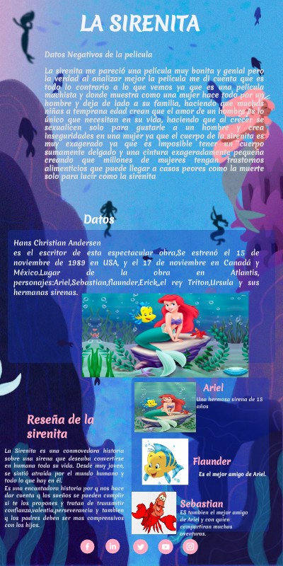 Datos Negativos de la peliculaLa sirenita me pareció una película muy bonita y genial pero la verdad al analizar mejor la película me di cuenta que es todo lo contrario a lo que vemos ya que es una película machista y donde muestra como una mujer hace todo por un hombre y deja de lado a su familia, haciendo que muchas niñas a temprana edad crean que el amor de un hombre es lo único que necesitan en su vida, haciendo que al crecer se sexualicen solo para gustarle a un hombre y crea inseguridades en una mujer ya que el cuerpo de la sirenita es muy exagerado ya que es imposible tener un cuerpo sumamente delgado y una cintura exageradamente pequeña creando que millones de mujeres tengan trastornos alimenticios que puede llegar a casos peores como la muerte solo para lucir como la sirenita