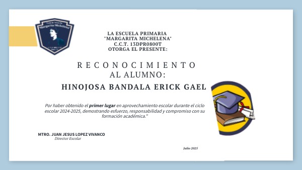 Por haber obtenido el primer lugar en aprovechamiento escolar durante el ciclo escolar 2024-2025, demostrando esfuerzo, responsabilidad y compromiso con su formación académica."